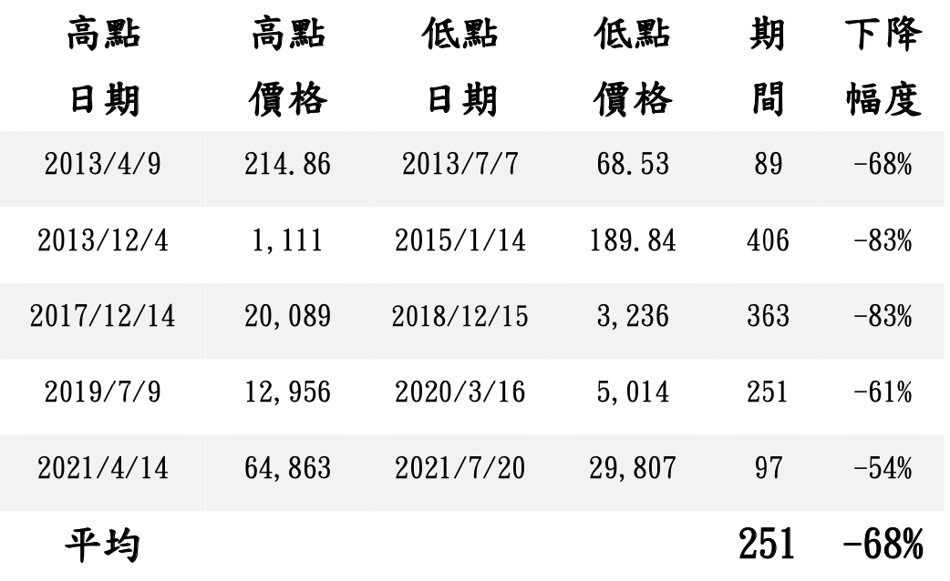 表:比特幣歷年熊市跌幅
