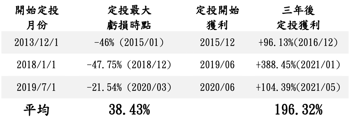 我們挑選了三次熊市,從該次熊市一開始幣價的最高點開始定投做數據回測,我們可以發現:定期定額即使是從最高點開始執行,三年後獲利幅度平均仍可達到 196.32%,能市中沒人能預測何時是底部,但堅持定期定額不失為面對漫漫熊市的好策略。