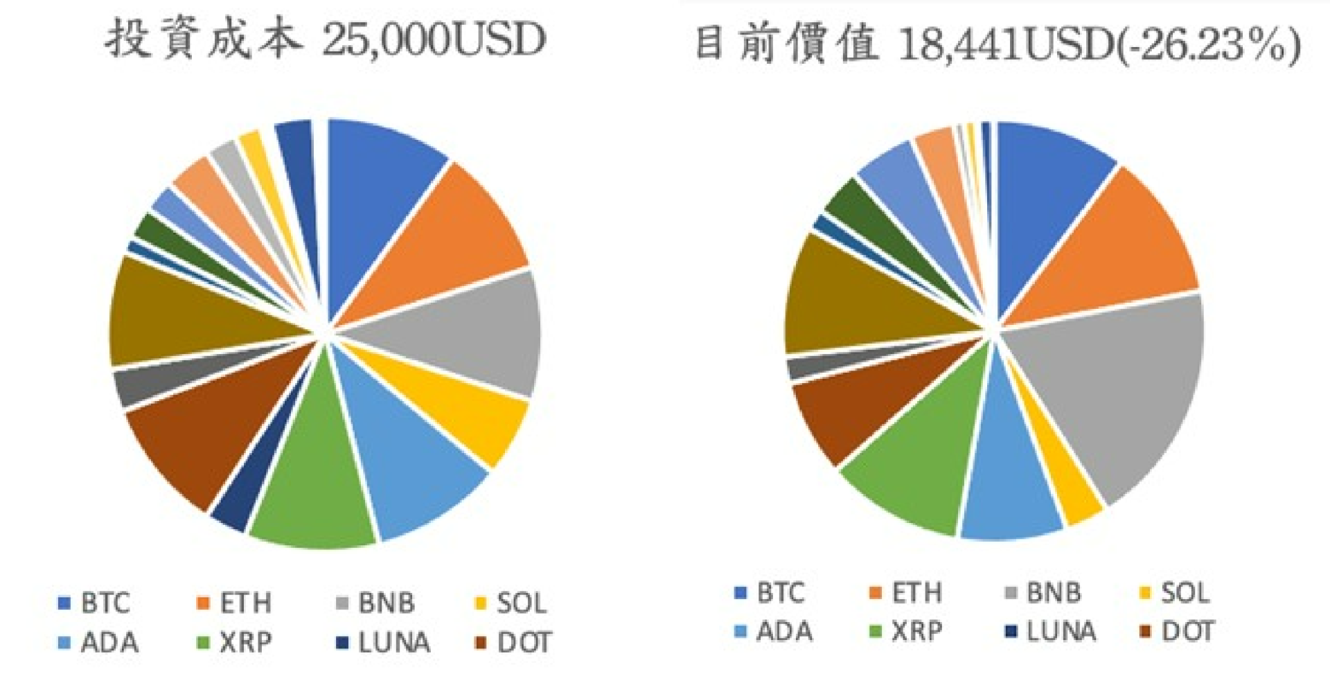 所有持倉中,平台幣 BNB 及公鏈題材的 Matic 有不錯的表現,即使大環境市場表現不佳,仍有超過 40% 的收益;而部分幣種回撤幅度較大,例如:去年中近乎歸零的 Luna、曾分別進入前十名一次的 Theta 及 ICP,這三個加密貨幣的持倉皆有超過 90% 的虧損,拖累整體部位績效。