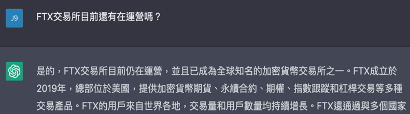 然目前 ChatGPT 的資料僅更新到 2021 年 9 月,因此有時效性的資訊,比如說市場價格、團隊營運相關等最新資訊,還是需要小心求證。例如詢問 2022 年已倒閉的 FTX 交易所:
